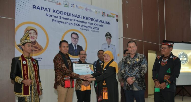 Penjabat Gubernur Aceh yang diwakili oleh Kepala Badan Kepegawaian Aceh, Abdul Qahar, S.Kom., M.M., menerima Piagam Penghargaan BKN Award 2023 pada acara Rapat Koordinasi Kepegawaian – Norma Standar Prosedur dan Kriteria (NSPK) yang diadakan di Aula Setda Kab. Bener Meriah, Redelong, Kabupaten Bener Meriah, Kamis (20/07/2023).