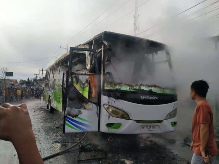 Satu unit bus pariwisata yang mengangkut 42 pelajar terbakar di Depan gereja GKPS Tigarunggu di jalan besar Tigarunggu-Saribudolok Lingkungan I Tigarunggu, Kelurahan Tigarunggu, Kecamatan Purba, Kabupaten Simalungun, Rabu (17/4/2024).