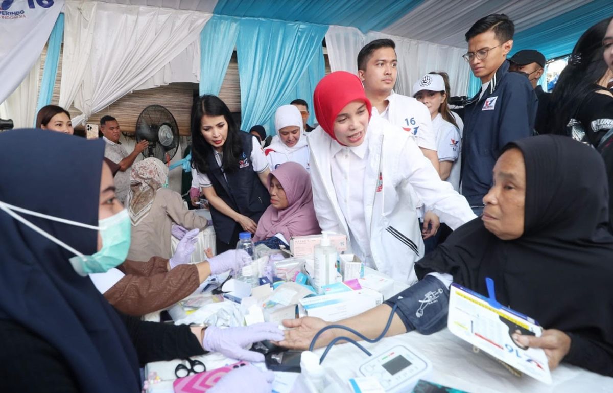 Ketua Umum Kartini Perindo, Liliana Tanoesoedibjo menghadiri kegiatan Bazar Murah dan Pengecekan Kesehatan Gratis di Pengadegan Timur III, Jakarta Selatan, Sabtu (20/1/2024).