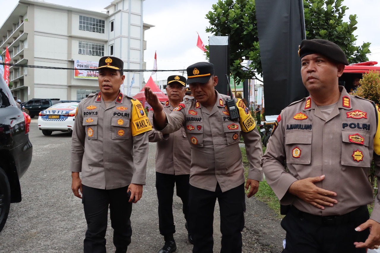 Wakapolres Pematangsiantar Kompol Ahmad Wahyudi damping Wakapolda Sumut Brigen Pol Ronny Samtana mendatangi venue PON XXI Aceh-Sumut di Aula Universitas HKBP Nomensen Kota Pematangsiantar,Sabtu 14 September 2024 pada Pukul 14.00 WIB